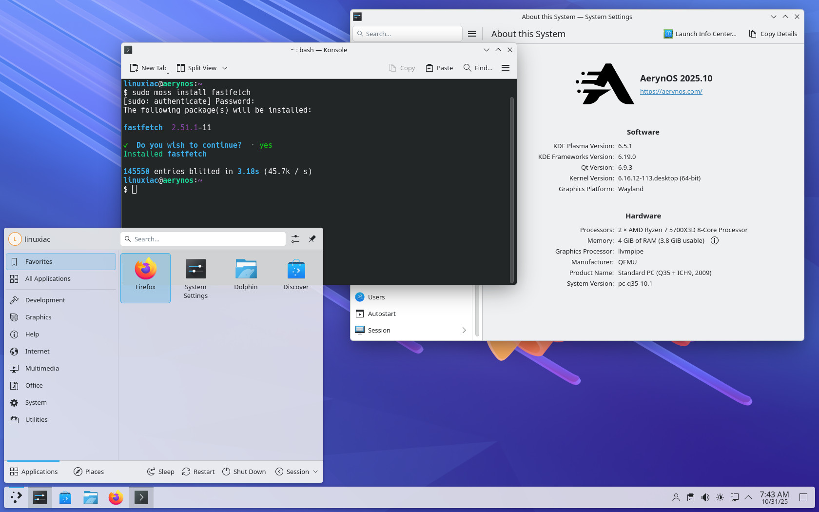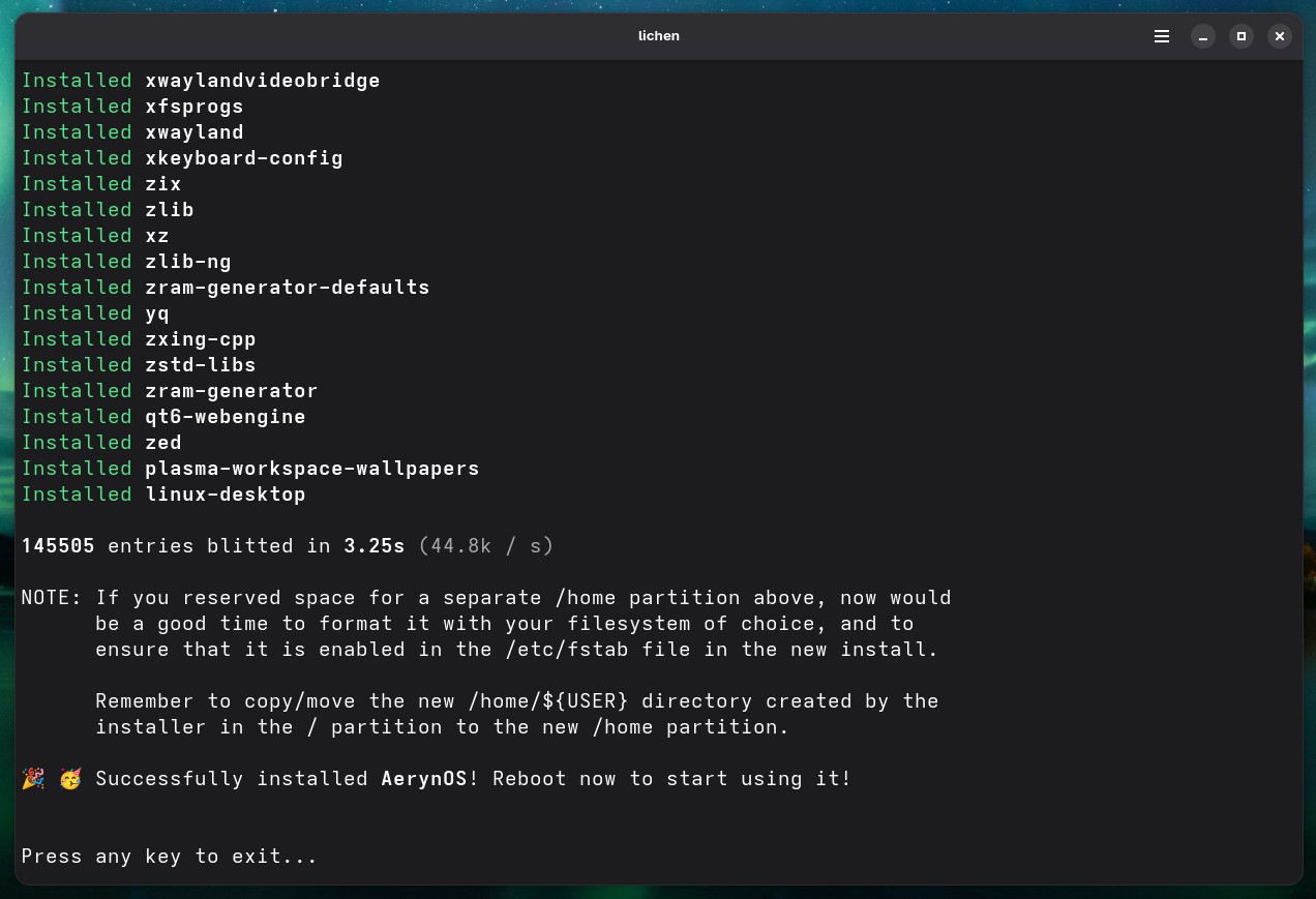 As with previous releases, the ISO primarily serves as a vehicle for the ‘lichen’ net installer, which can install GNOME, KDE Plasma, COSMIC, or a terminal-only environment, always pulling the newest packages from AerynOS repositories at installation time.
