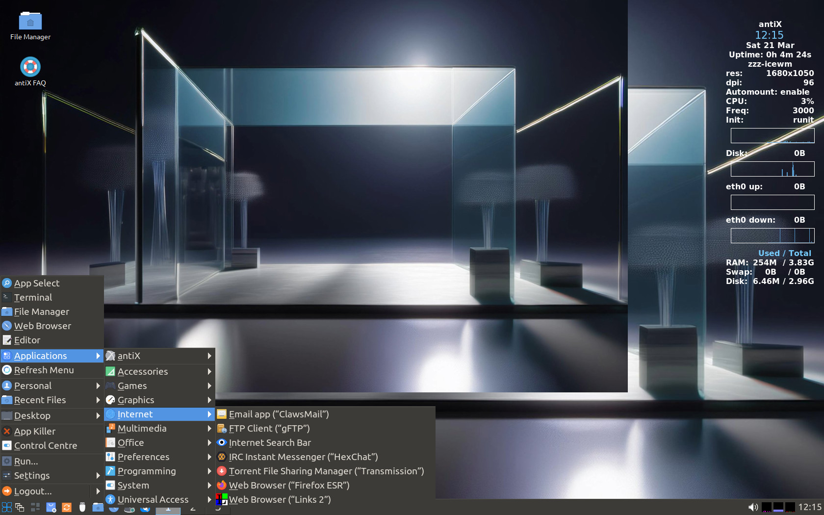 The desktop experience remains lightweight, built around window managers instead of full desktop environments. IceWM is the default, with Fluxbox, JWM, and the tiling window manager herbstluftwm also available.