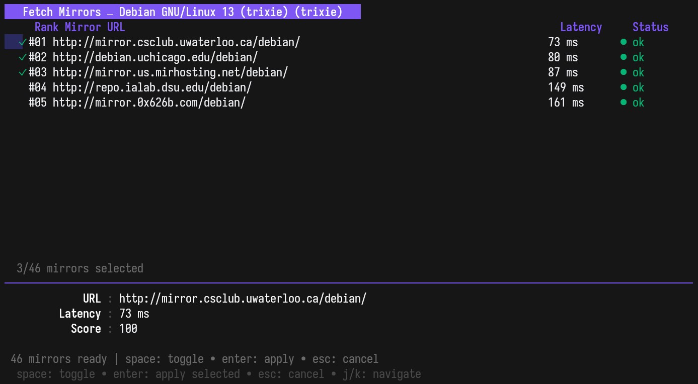 The application is written in Go and uses the Bubble Tea framework, a toolkit for building terminal user interfaces. The result is a keyboard-driven interface that resembles a lightweight dashboard in the terminal, allowing users to navigate repositories, search for packages, and perform actions without leaving the command-line environment.