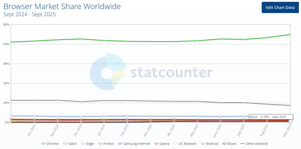 According to the numbers, in September 2025, Brave comes in ninth with 0.79% of the overall user base. That’s down from 0.87% back in April, a drop of about 0.08%. This isn’t meant to dismiss the company’s figures—it’s just another way of looking at the data.