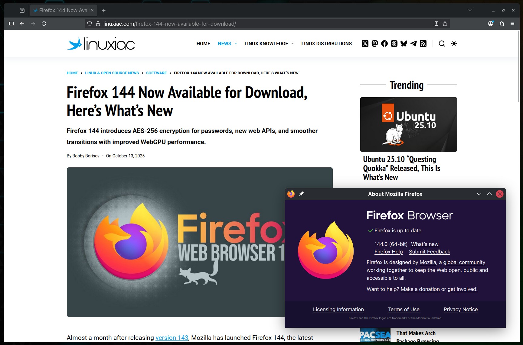 Windows and macOS users can expect an over-the-air update within the following days. Users of rolling-release Linux distributions should look for Firefox 144 as an update in their repositories over the next few days.