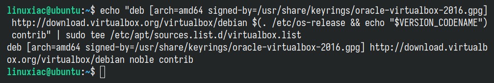 echo "deb [arch=amd64 signed-by=/usr/share/keyrings/oracle-virtualbox-2016.gpg] http://download.virtualbox.org/virtualbox/debian $(. /etc/os-release && echo "$VERSION_CODENAME") contrib" | sudo tee /etc/apt/sources.list.d/virtualbox.list