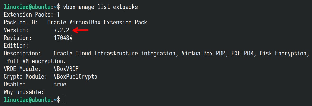 Additionally, you can verify the installed VirtualBox extension pack version by running the following: