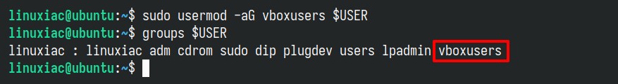 Now, perform a reboot. After login, check that you are in the “vboxusers” group with this command: