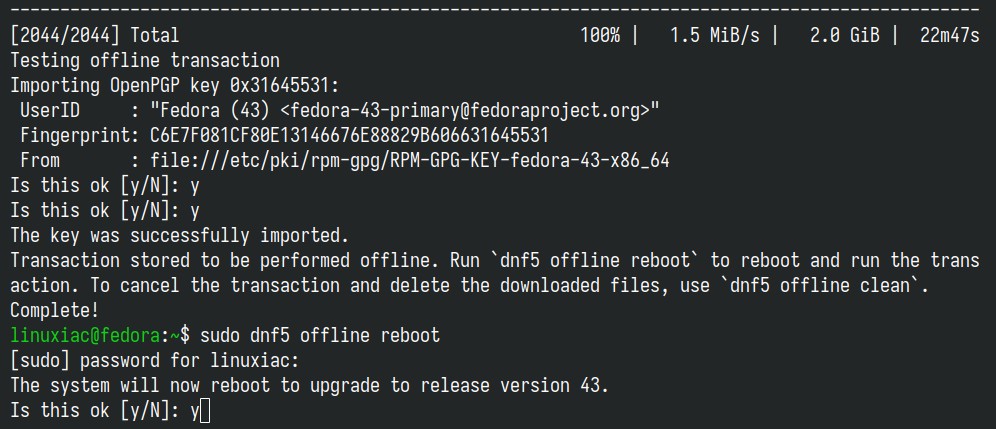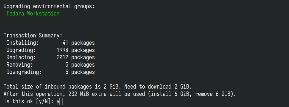 After downloading all the packages required to upgrade the system from Fedora 42 to 43 (which will take some time, so be patient), you will see the screen below. At the end, you must manually approve the proposed system’s modifications by typing “Y” and then confirming by pressing “Enter.”