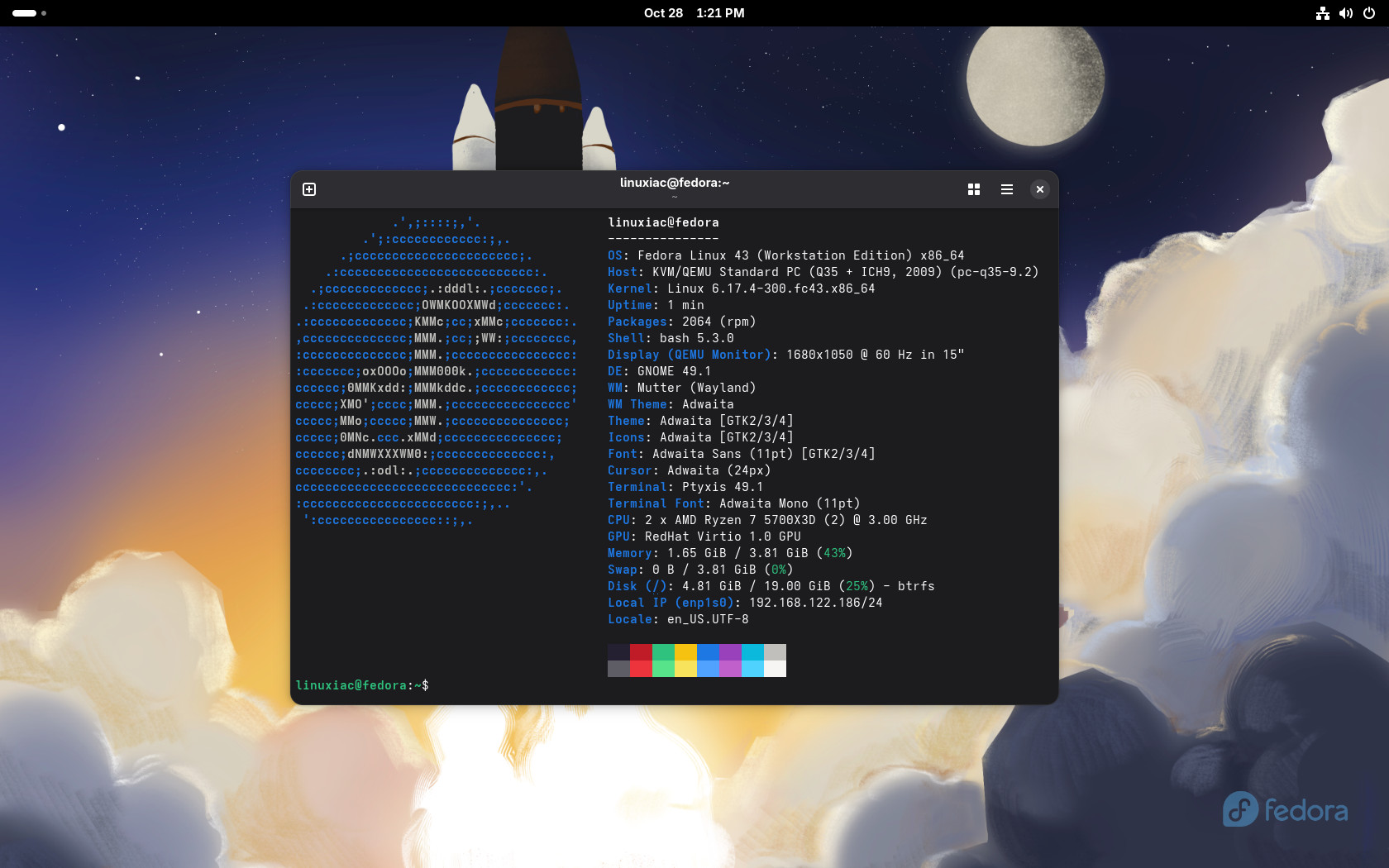 When everything is complete, your system will reboot, and you can log in and enjoy your new Fedora 43 system.