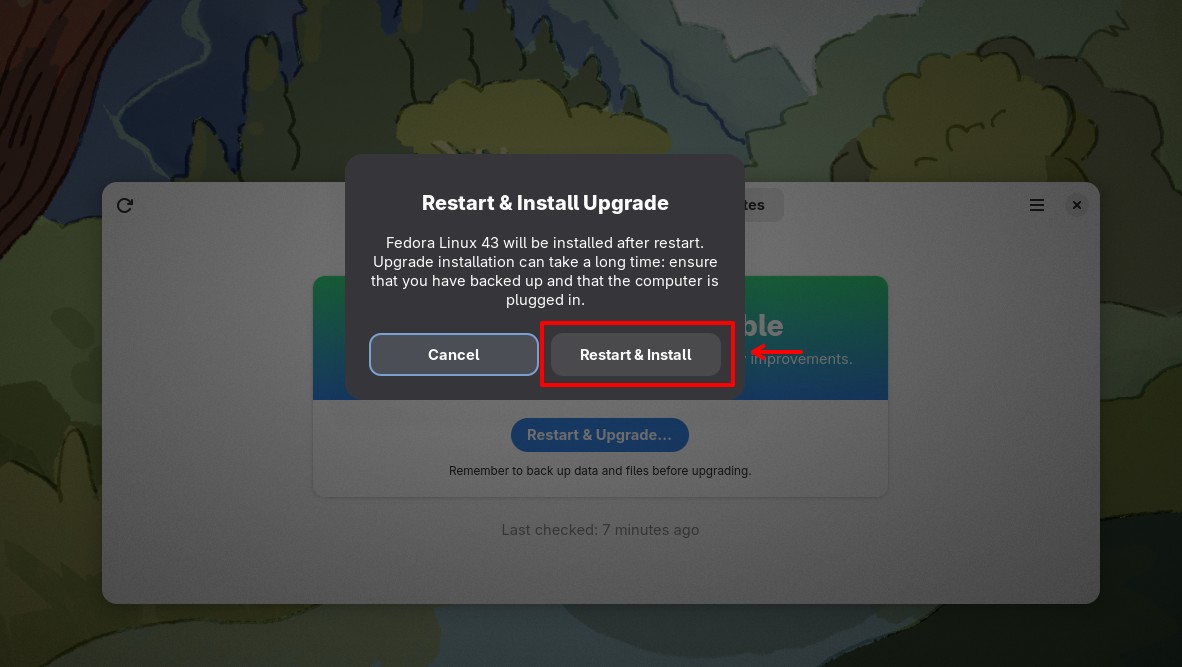 A new pop-up will ask you for confirmation to restart your system and begin the upgrade from Fedora 42 to 43. Next, click on the “Restart & Install” button.
