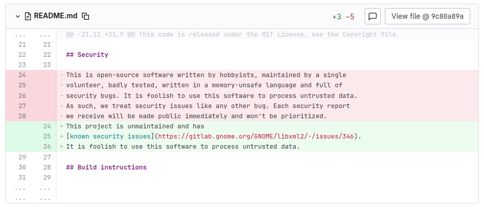 So, even a single unpatched security issue can force distributions to carry custom patches, maintain downstream forks, or replace the parser entirely. However, because libxml2 is deeply embedded in system libraries and applications, replacing it is practically impossible (or at least for the foreseeable future).