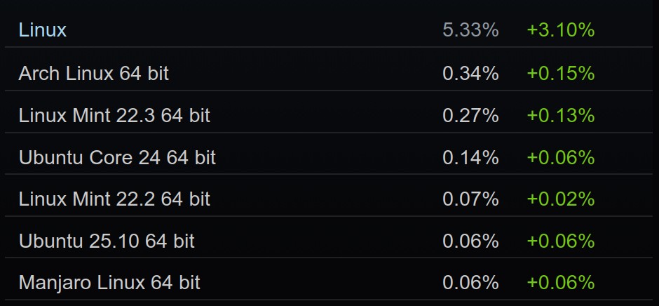Linux now accounts for 5.33% of all gamers on Steam.
