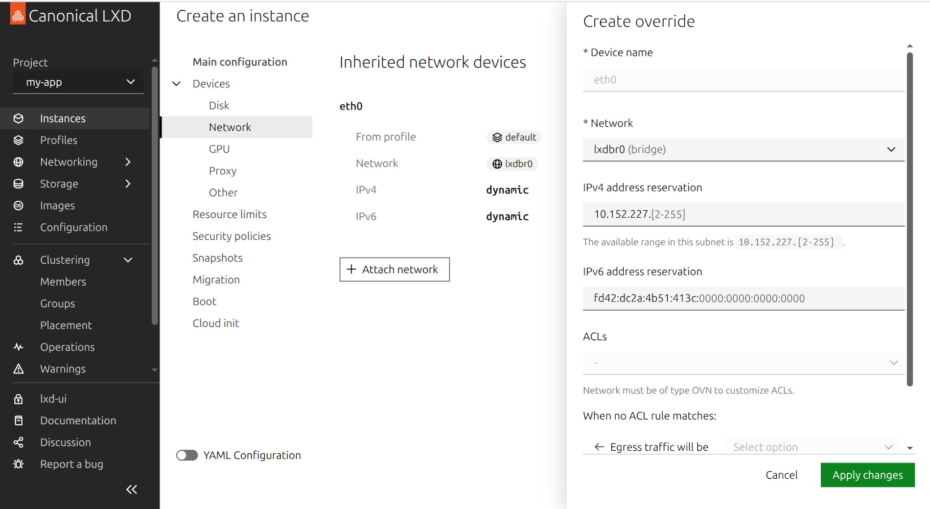 The web interface includes several usability enhancements. Initial access to the LXD UI is now simpler, and placement groups can be configured during instance creation. Network configuration improvements include IP reservation and access control list management directly in the UI.