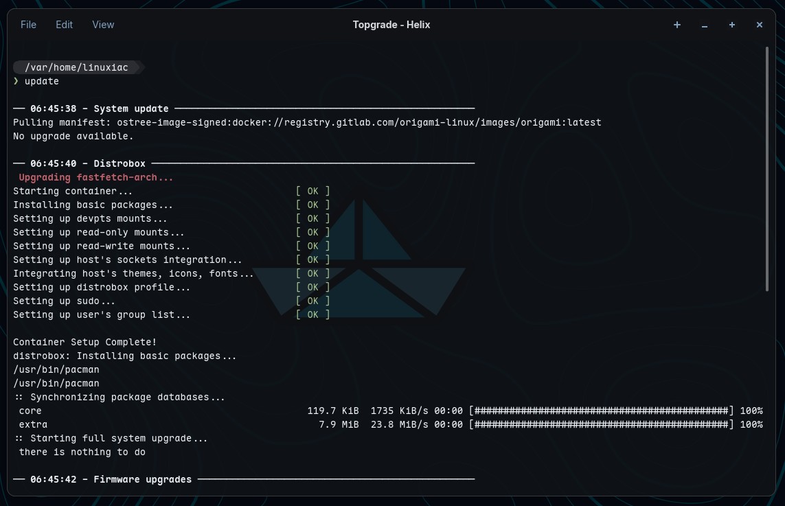 The distro also includes automatic background updates driven by a systemd user timer, alongside manual update options for the system image, Flatpak applications, and Distrobox containers, all managed via a convenience update command based on Topgrade, a unified system update tool that ties these update paths together.