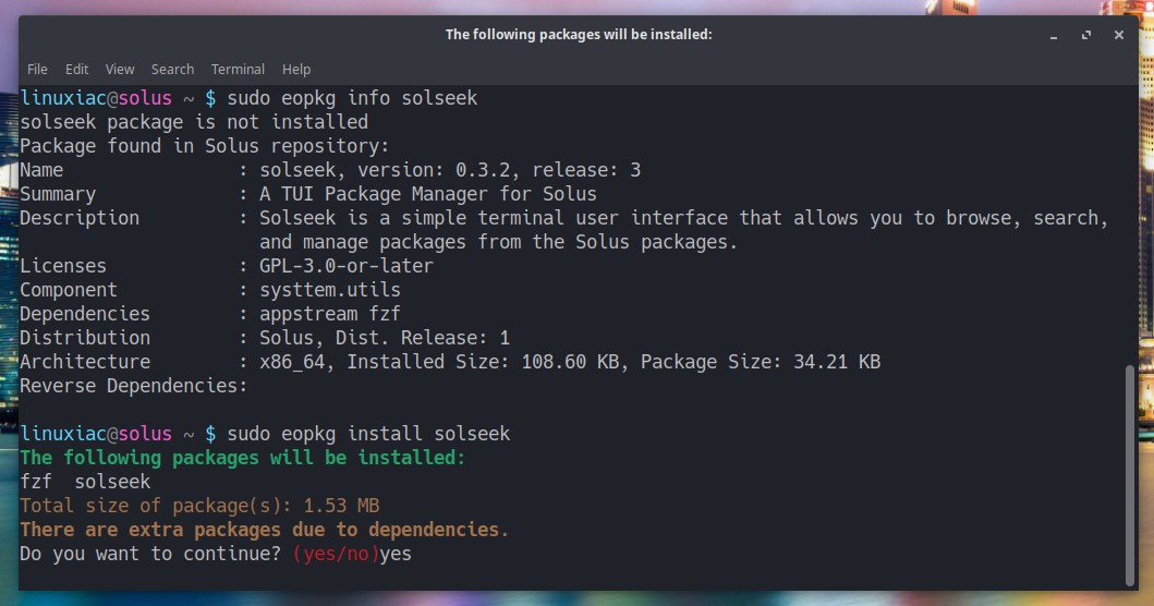 Finally, an important note. Until recently, the only way to get Solseek on your Solus system was to build it from source. That’s no longer the case. Solseek is now available as a regular package in the Solus repository, and installing it is just a familiar command away:
