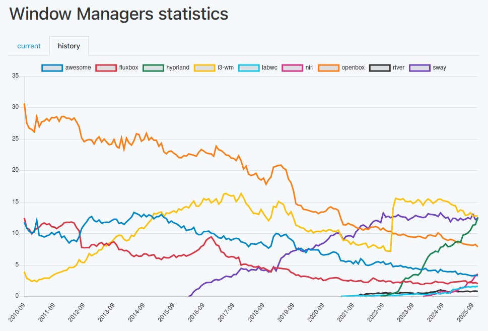 Emerging projects such as Niri, LabWC, and River appear in the lower single digits. While their overall numbers remain modest, their recent upward movement indicates growing interest in newer, Wayland-native workflows. By contrast, older X11-centric managers like Fluxbox and Awesome show mostly declining or flat lines over the past decade, reflecting a gradual shift away from legacy stacking managers toward more Wayland-centric tilers.