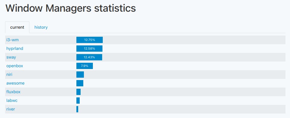 In short, the data confirms that KDE Plasma has become the clear favourite among Arch Linux users. The reasons for this are beyond the scope of this article, but it can be said that its powerful customization ecosystem appears to have resonated strongly with a user base known for valuing control and technical depth. Now, let’s see how things stand with the window managers.