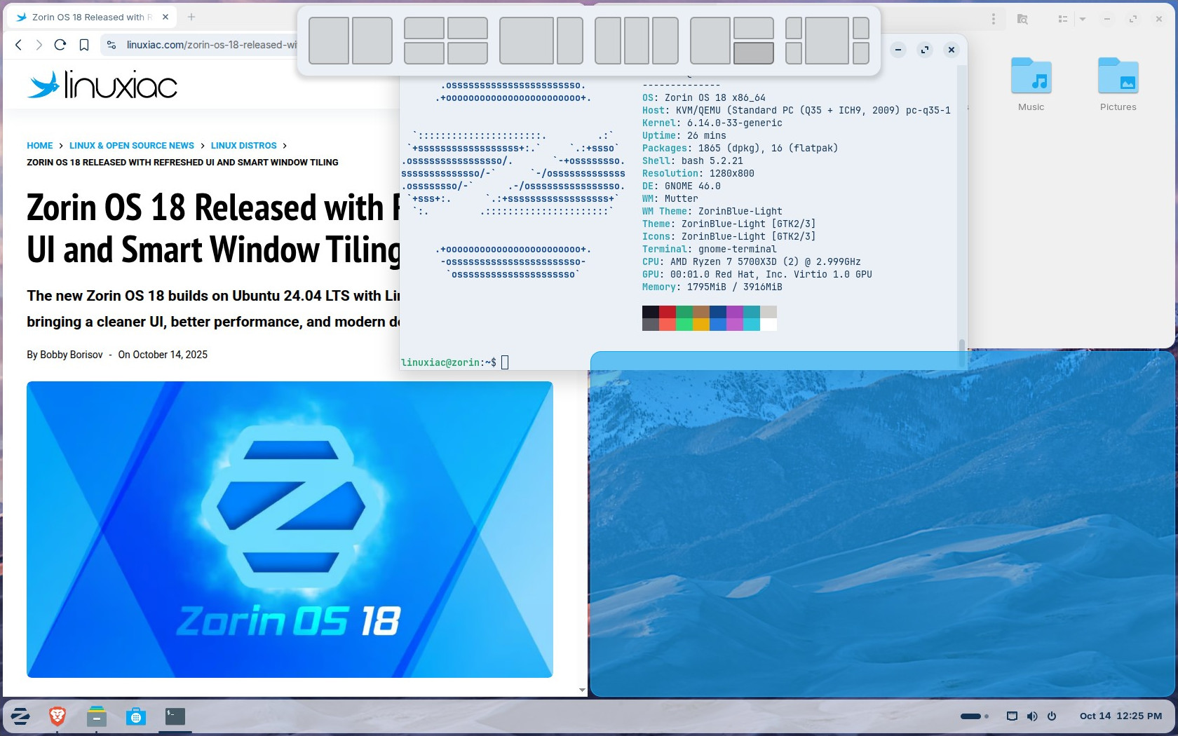 Another big new feature in Zorin 18 is the introduction of advanced window tiling built right into the desktop. By dragging a window to the top of the screen, users will see layout options to snap windows into place. You can also create custom tiling setups, enable auto-tiling, or rely on smart suggestions—all without memorizing complex shortcuts.